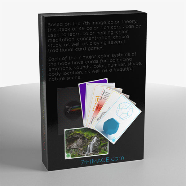 Based on the 7th Image color theory, this deck of 49 color rich cards can be used to learn color healing, color meditation, concentration, chakra study, as well as playing several traditional card games. Each of the 7 major color systems of the body have cards for: Balancing emotions, sounds, color, number, shape, body location, as well as a beautiful nature scene.